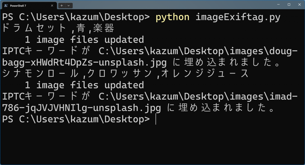 画像の取得などはPythonの標準的なライブラリーで可能ですが、IPTCキーワードの埋め込みだけはPythonの標準ライブラリーではできないため、exiftoolを利用します。